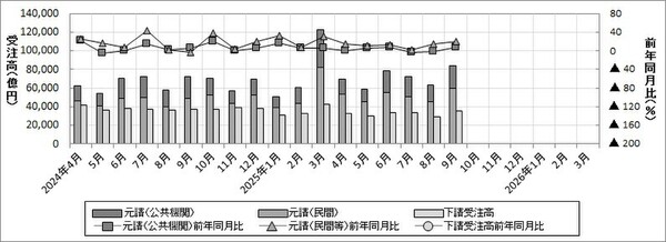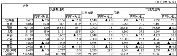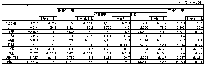 9月の建設工事費受注高の全国合計は11兆9,516億円(前年同月比9.4%)で、