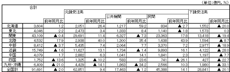 8月の建設工事費受注高の全国合計は9兆1,691億円(前年同月比▲2.0%)で、