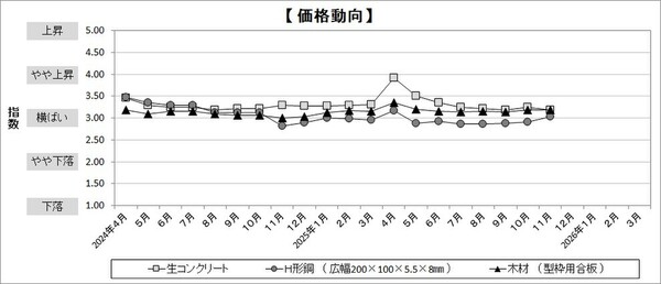 ・生コンクリート、H形鋼、木材とも、“横ばい”となっている。
