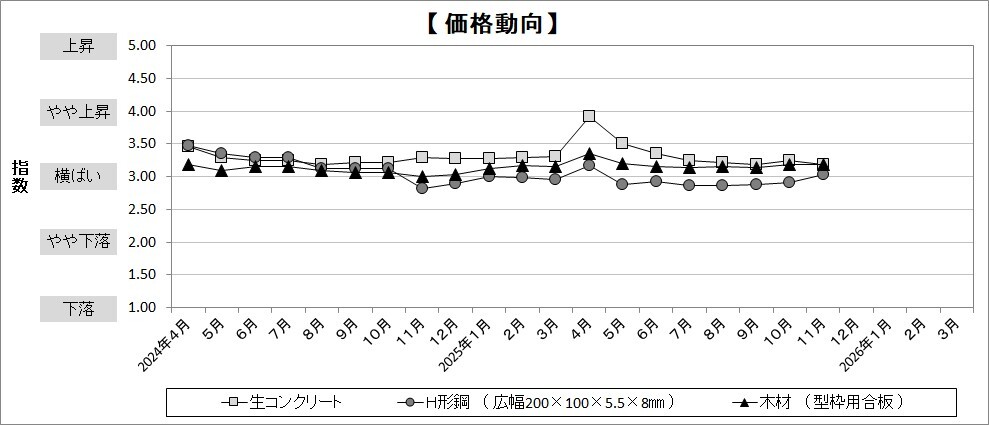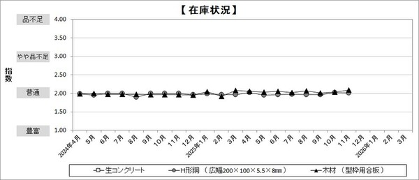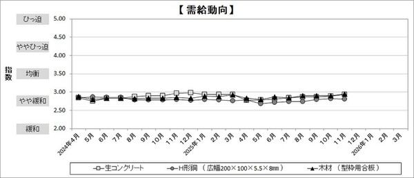 ・生コンクリート、H形鋼、木材とも、“均衡”となっている。