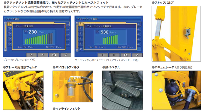 ブレーカ、クラッシャ等が装着できる共用配管を装備。