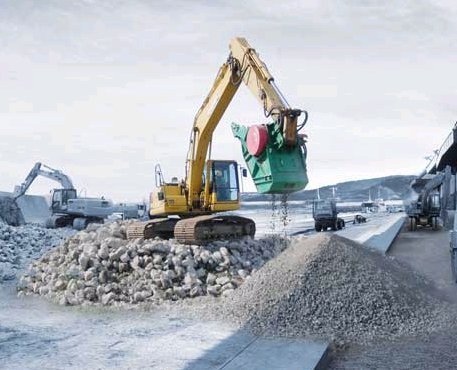 現場で発生するコンクリート塊(有筋、無筋)を、現場内でバックホー(山積0.8㎥)にて簡易に再生骨材とし、現場内で利用することを可能にする再生骨材製造機(バックホーアタッチメント)です。
